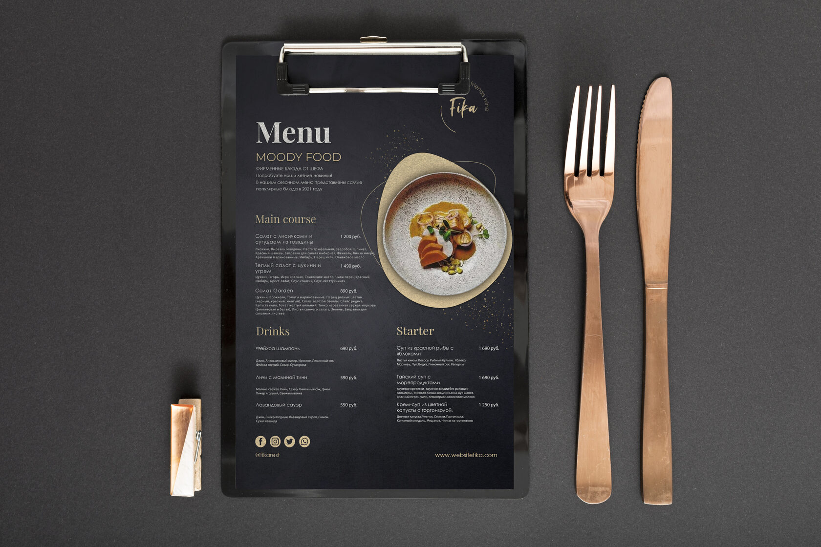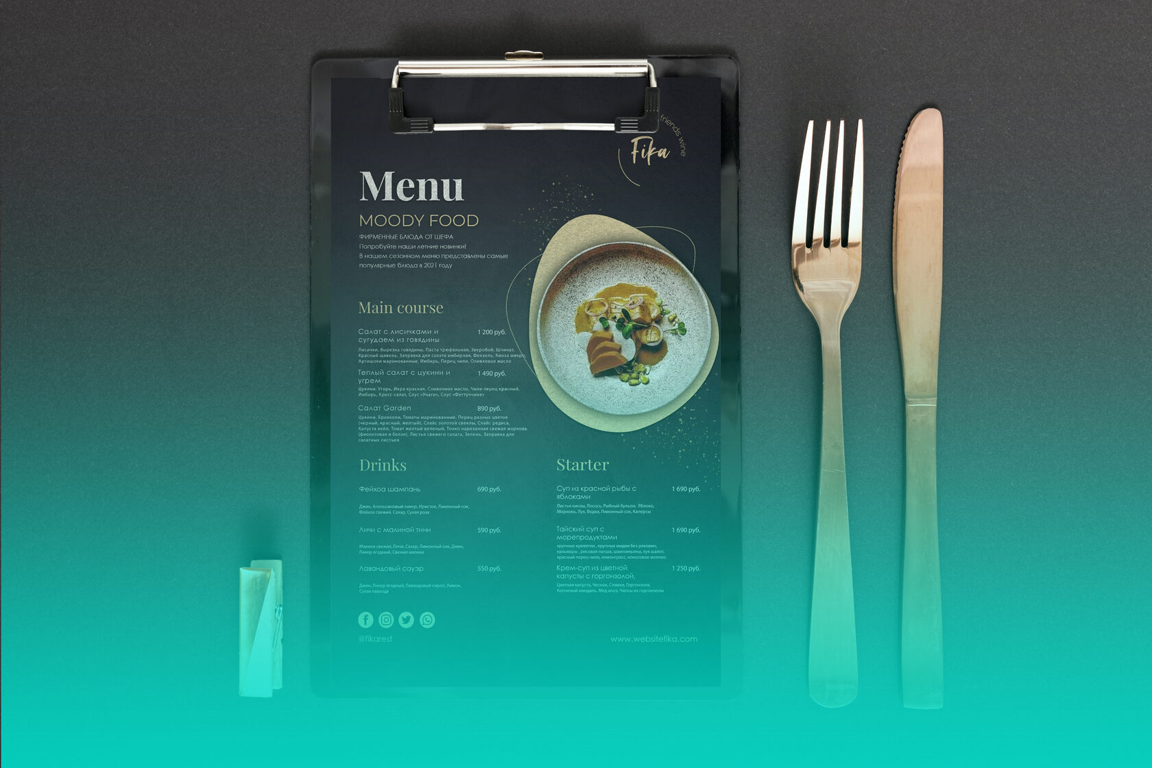 Меню, упаковка продукции, приглашения, листовки, афиши, наклейки и т.п.